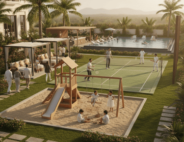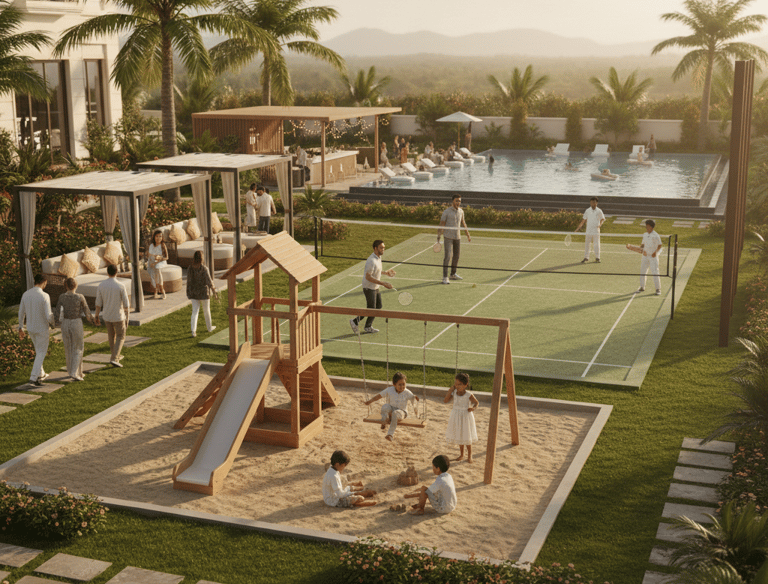 Enjoy outdoor activities with a dedicated play area, badminton court, and cricket space for kids and adults.